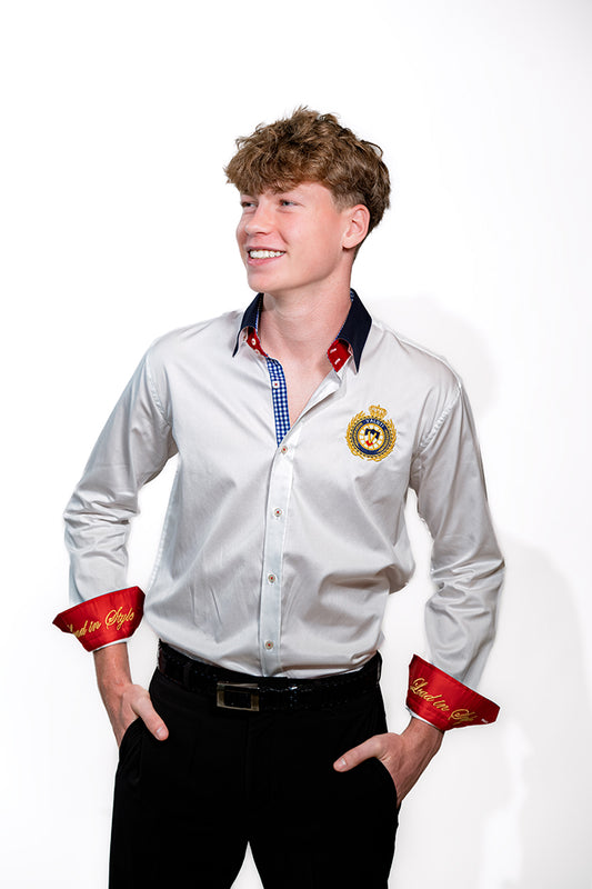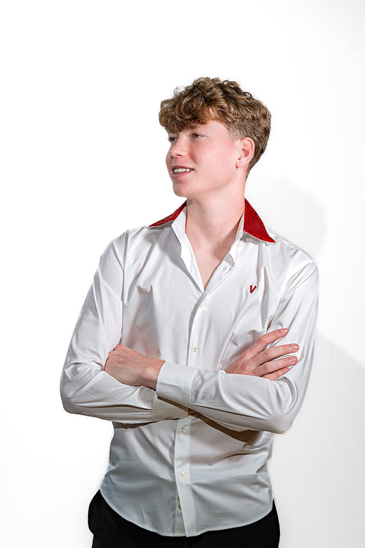 Valnti White Button-Up Shirt with Red Cuffs and Lead in Style Embroidered Crest