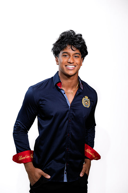 Valnti Navy Blue Button-Up Shirt with Red Cuffs and Lead in Style Embroidered Crest