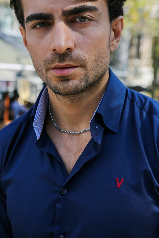 Stylish Dark Blue High Collar Dress Shirt