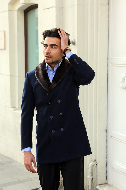 The Double-Breasted Navy Blue Overcoat