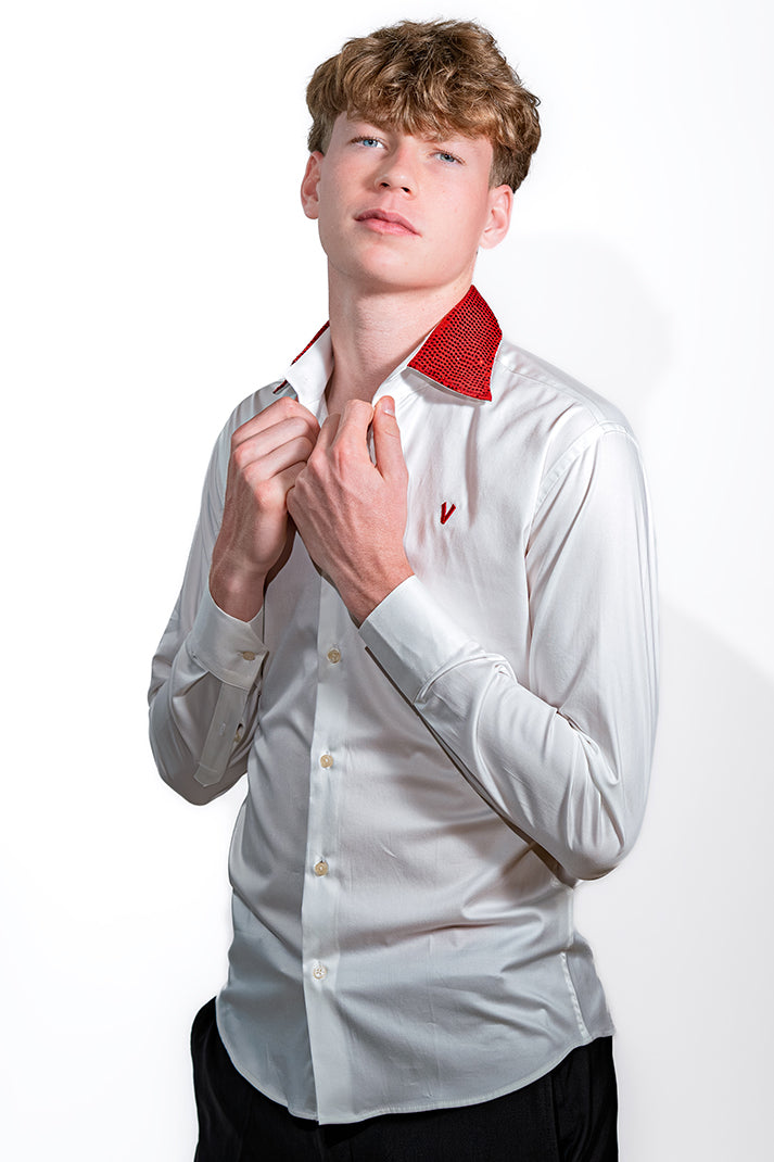The centerpiece of this shirt is its eye-catching sequence collar, intricately designed to shimmer subtly under the light, adding a luxurious edge to your formalwear. The vivid red patterning on the shirt enhances the structured fit, offering a contemporary twist on a timeless classic.
